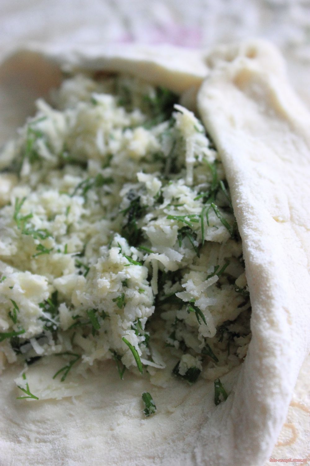 Слепить снежок из сырной массы, положить в центр Защипнуть тесто от краев к центру ( припудривая пальцы мукой )
