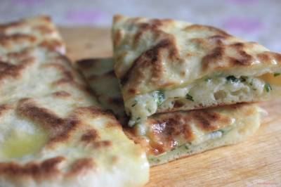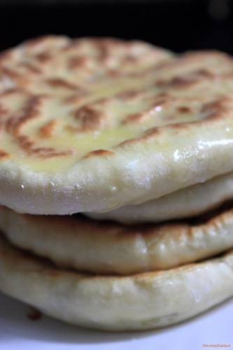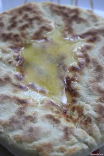 Припудривая мукой, распределить заготовку в лепешку, расправляя пальцами, стараясь обходиться без дырочек Перевернуть на мучную ладонь ( швом вниз ) обхлопать, стряхивая излишки муки Выложить на сухую, горячую сковороду ( стороной с защипом ), прикрыть крышкой, печь до румянца Перевернуть, допечь лепешку, смазать маслом