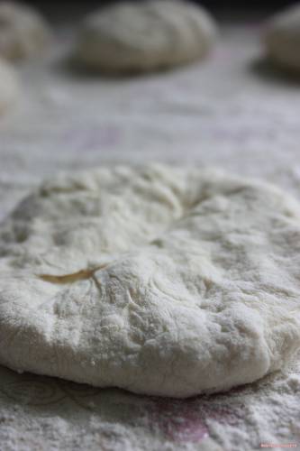 На припыленном столе, поделить тесто на части ( делила на 5 )