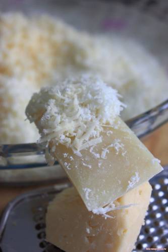 Натереть на мелкой терке сыр ( смочив терку водой )