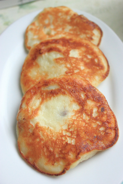 Участвуют: Мука 100 г ( 0, 8 стакана ) Творог 150 г ( комнатной температуры) Простокваша 1 стакан Яйцо 1 шт. ( комнатной температуры) Сахар 3 ч. л Сода 1/4 ч. л Изюм по желанию ( распарить в теплой воде, 15 минут ) Масло для жарки